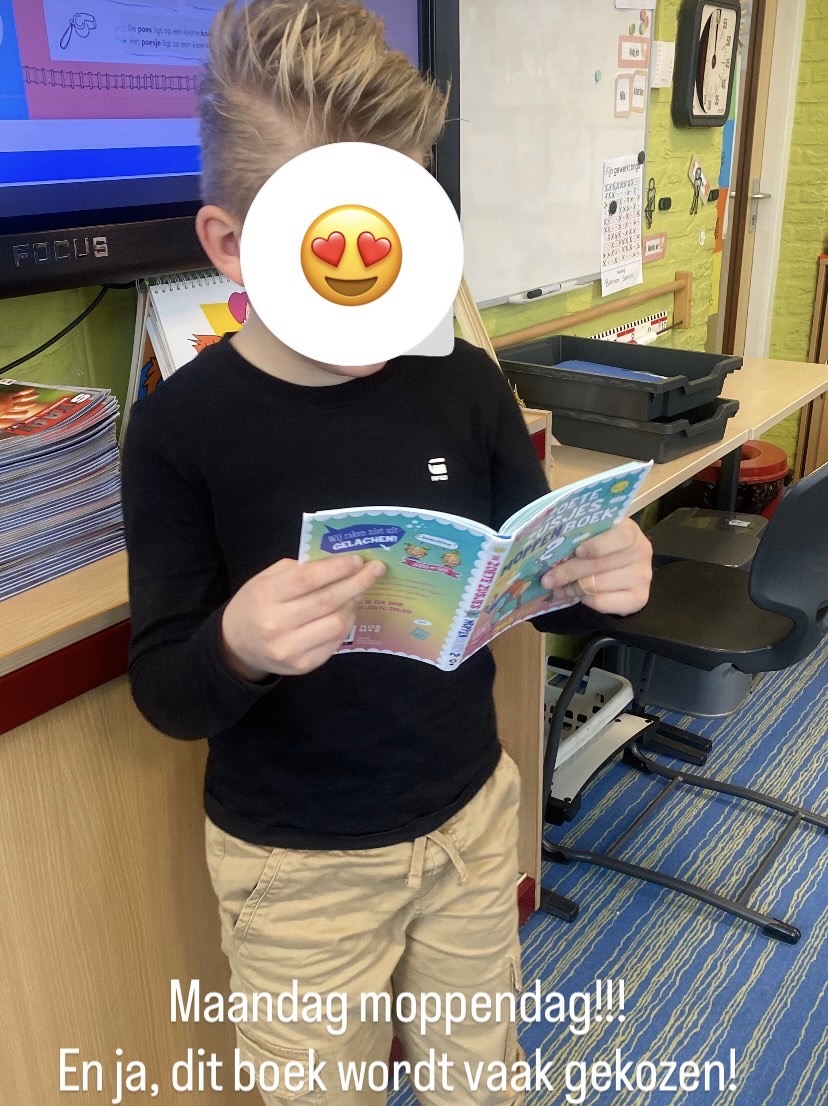 Elke maandag is er weer een ander kind aan de beurt om een mop voor te lezen. En dat maakt altijd een gezellig moment. Sommige kinderen snappen de moppen niet, dus leggen anderen ze weer uit. Samen komen we er altijd wel uit. Heerlijk om dit zo met de kinderen te doen.